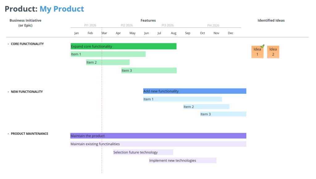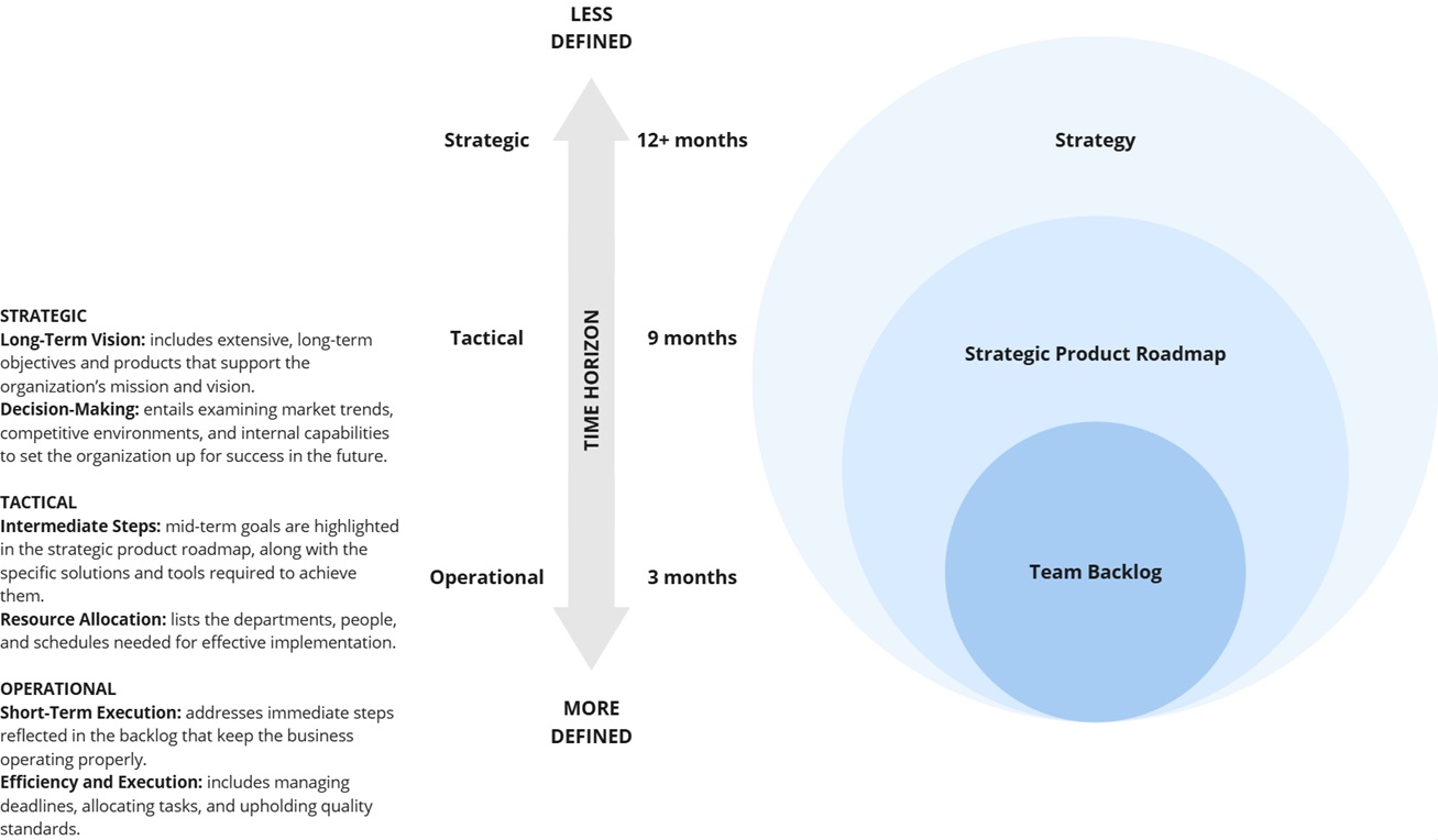Connecting strategy to execution and communication ensures that everyone – from leadership to delivery teams – is aligned on where the product is going, why it matters, and how work translates into results. A strategic roadmap acts as a shared reference point that links high-level goals with day-to-day activities, while also providing a clear narrative for stakeholders. This reduces misalignment, improves decision-making, and keeps teams focused on delivering meaningful outcomes.